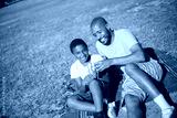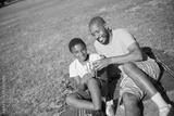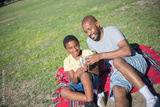 Portrait of young African American man and boy sitting on ground. Smiling happy father resting with boy in park both holding ice cream cones. Fatherhood, leisure and having rest together concept