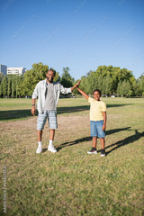 Portrait of happy African American man and boy having good time. Smiling father and his son in casual clothes standing giving five and looking at camera. Leisure, free time together concept