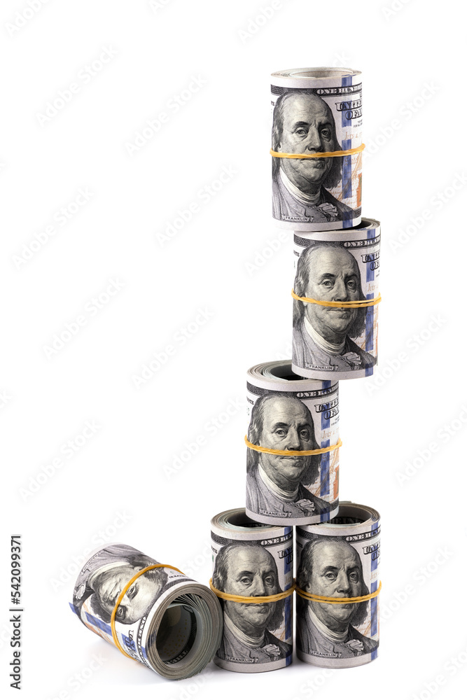 Several rolled-up bundles of 100 American dollars bills on a white background