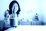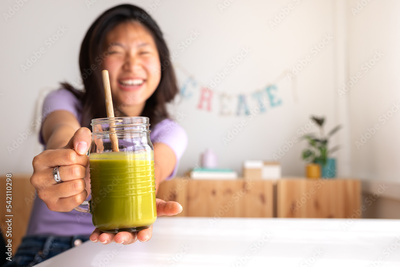 Happy teen asian female student showing healthy green juice at camera. Focus on juice. Copy space. Healthy lifestyle