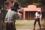 Backside view of cowboy while standing gun prepares on gunfight in cowboys village is cowboy western lifestyle concept.