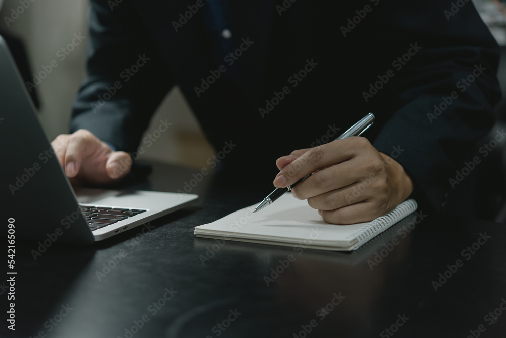 businessman hand holding pen writing on notebook working with laptop computer in modern office.Write on journal diary concept.