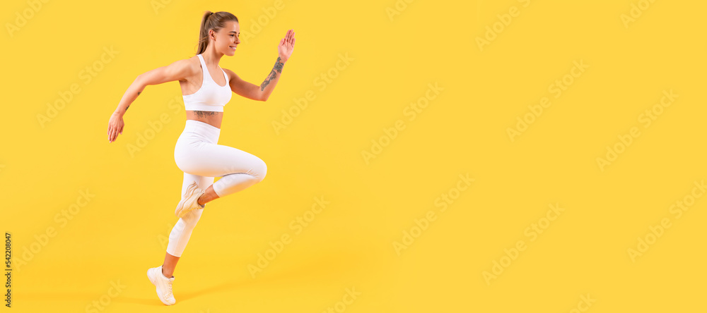 fitness girl runner running on yellow background. Woman jumping running banner with mock up copyspace.
