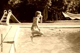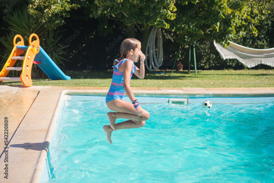 Side view of little Caucasian girl jumping into pool. Fair-haired girl training jumps into water covering nose with her hand looking down at water. Healthy rest and spending summer vacation concept