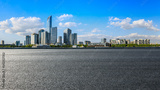 Asphalt road and city skyline with modern building in Suzhou, China.