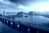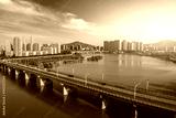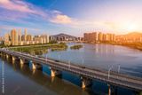 Aerial view of city skyline and modern buildings in bengbu at sunset, China.