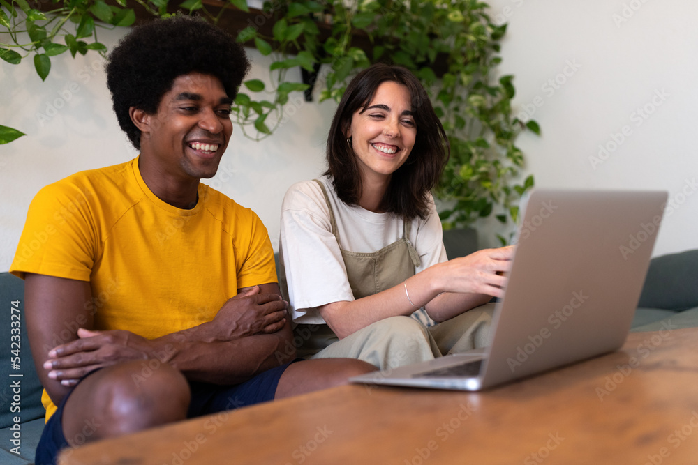 Smiling young multiracial couple sit on the couch together using laptop to chat with family in a video call.