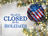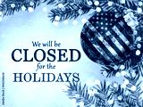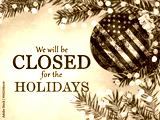 We will be closed for the Holidays. Beautiful signboard for Christmas and New Year holidays. Colorful Christmas balls on the background of the Christmas tree. Closeup, top view. Holidays concept