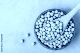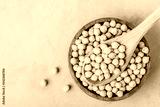 Chickpeas. Raw organic chickpeas grains in wooden bowl on gray stone background, top view