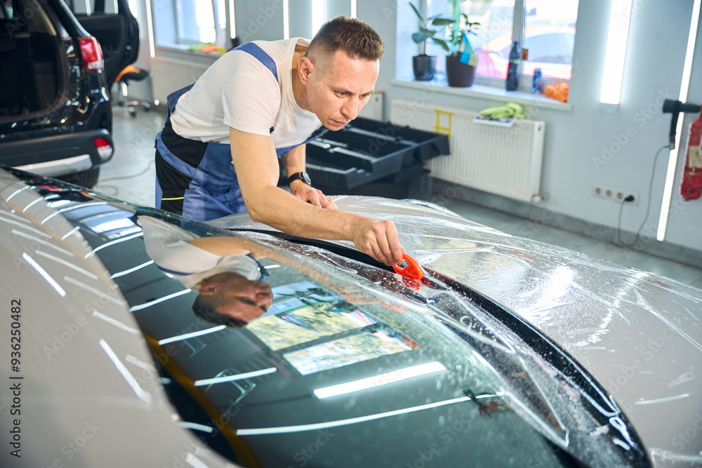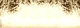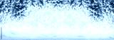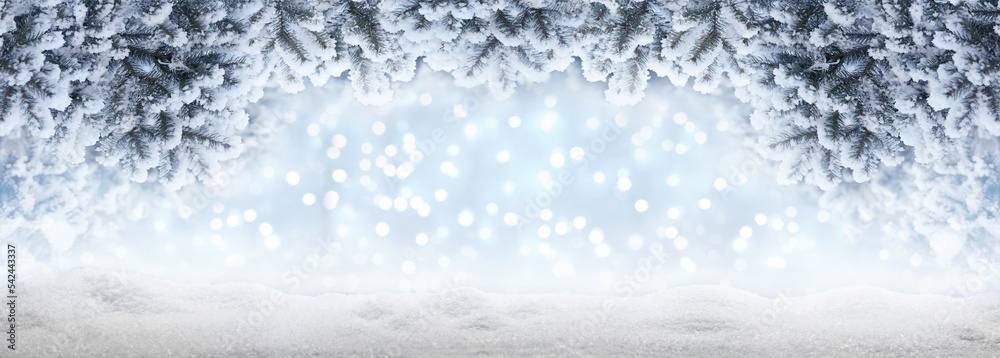 Snow covered spruce branches with Christmas blurred garland lights. Beautiful, winter, New Year's, holiday background with a copy space. Banner 2023.