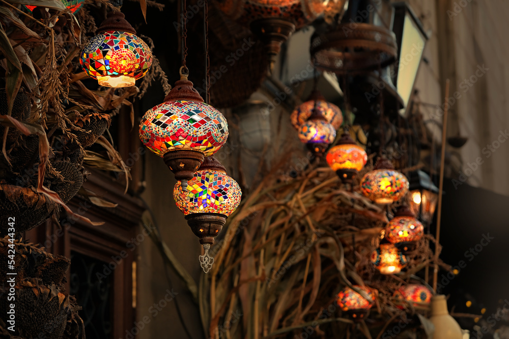 home entrance decorated in autumn style. beautiful vintage lanterns and dried plants close up. Festive decor for fall season, Thanksgiving, Halloween holiday.