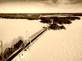 Aerial view of white cable-stayed bridge with snow lakes и green woods in Finland, winter landscape