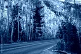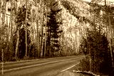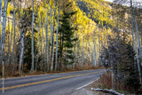 Paved road scenic byway in morning sunrise near Aspen, Colorado in green autumn early winter with fall yellow foliage on trees forest on Independence Pass Rocky Mountains