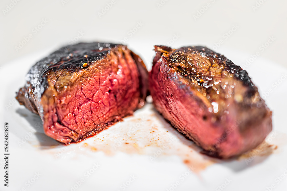 Macro closeup of cooked rare blue red raw petite sirloin steak cut inside on white plate on table isolated against white background