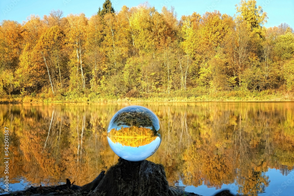 Magic Crystal ball on beautiful abstract autumn background. fall season scene. autumn forest landscape with clear crystal ball for meditation, relax, esoteric Witchcraft practice, spiritual ritual.