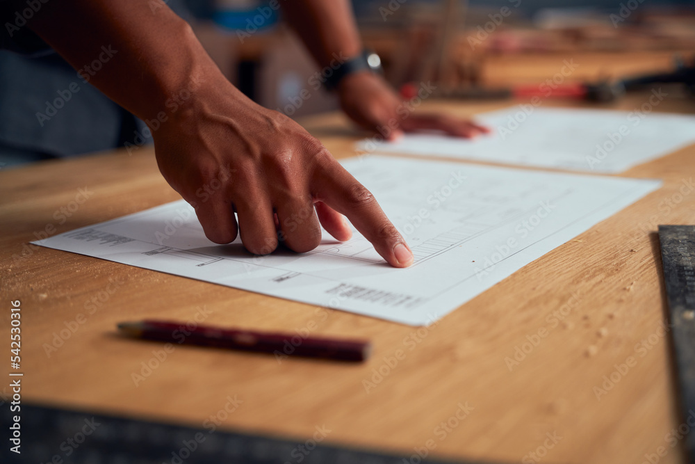 Close-up of young man pointing at paper and writing with pencil in woodworking factory