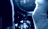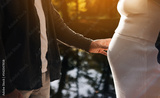 cropped photo of couple, man and pregnant wife are holding hands and walking by the lake on sunlight sunset. Happy family enjoying pregnancy on nature. The concept of Mother's Day and Women's Day.