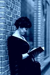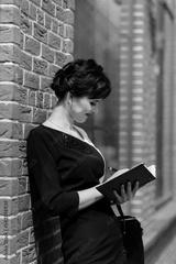 Attractive businesswoman is doing notes in paper notebook in the street with office buildings in the background. Executive in business wear is resolving work issues during the lunch break outdoors