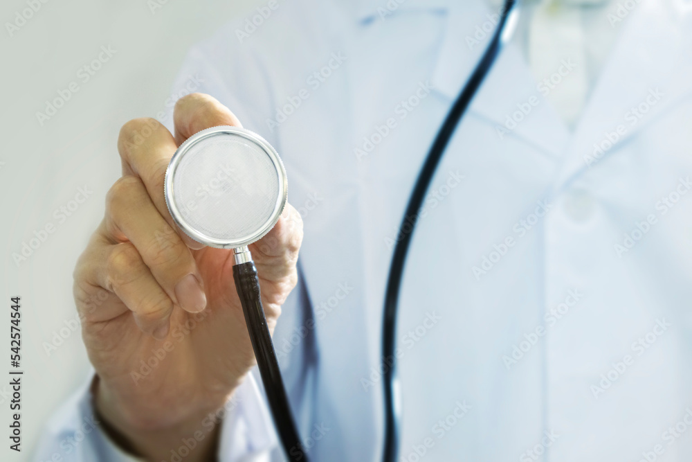 A half-standing doctor, without a face, holding a stethoscope against a white background.,doctor holding a stethoscope,physical examination,health check