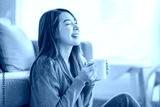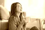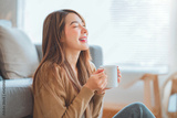 Joyful young asian female enjoying a cup of coffee while sitting on the rug beside to the sofa at home, Cosy scene, Smiling pretty woman drinking hot tea in autumn winter.