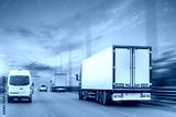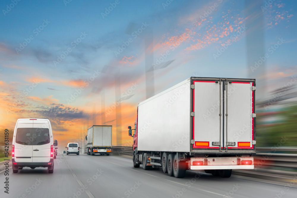 Heavy traffic flow of car traffic on a freeway in an urban environment at a time, motion speed blur effect. Trailer trucks and minibuses and other vehicles drive on the road.