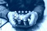 Hand-holding smartphone with an email icon and star emoticon over group people concept for satisfaction responding. Ratings, reviews, survey responses, information. Man using phone with laptop