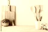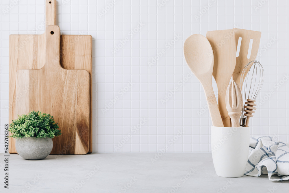 Kitchen utensils. Kitchen wooden tools and kitchenware. White modern kitchen interior background.