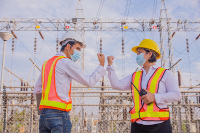 Teamwork Electrician Engineer standing on factory power plant, Teamwork Electrician Engineer concept