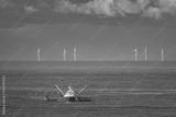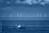 A cutter with lifted drag nets on the North sea with wind turbines in the background
