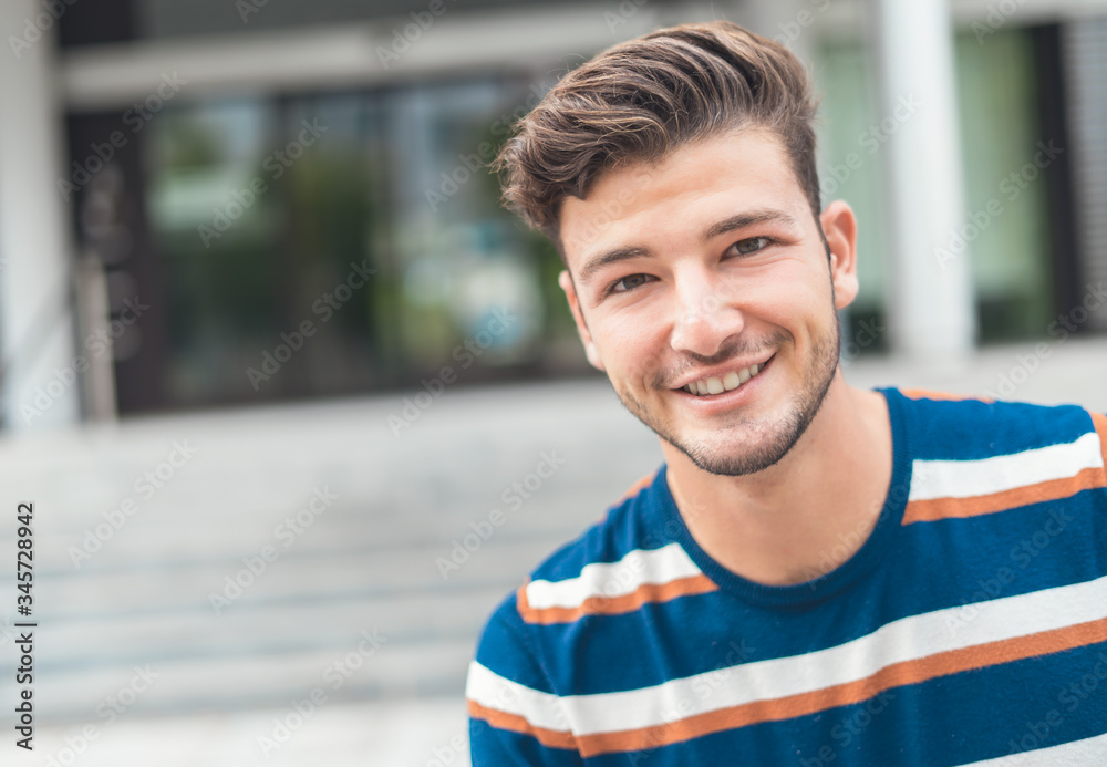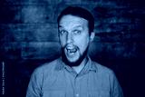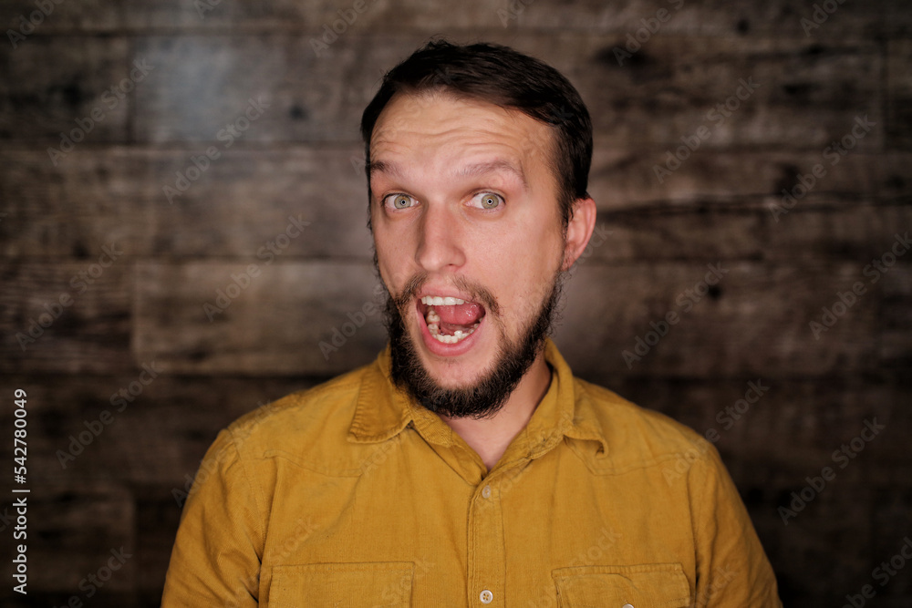 Attractive young man grimacing, joyful positive caucasian guy with beard wearing yellow shirt, looking at camera with funny face expression and opened mouth, clowning and having fun indoors.