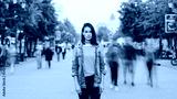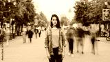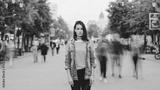 portrait of tired young woman student standing alone in city center and looking at camera with straight face while crowds of men and women are whizzing around.