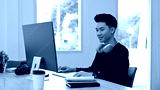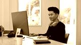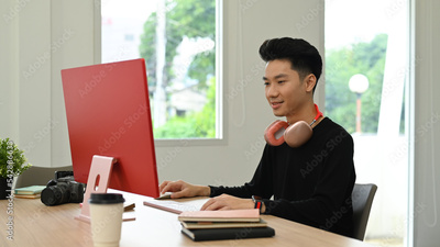 Smiling asian male photo editors retouching photos on personal computer, working in creative office