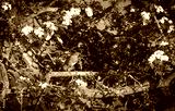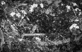 Robin sitting in a hawthorn hedge with blossom in spring, UK