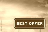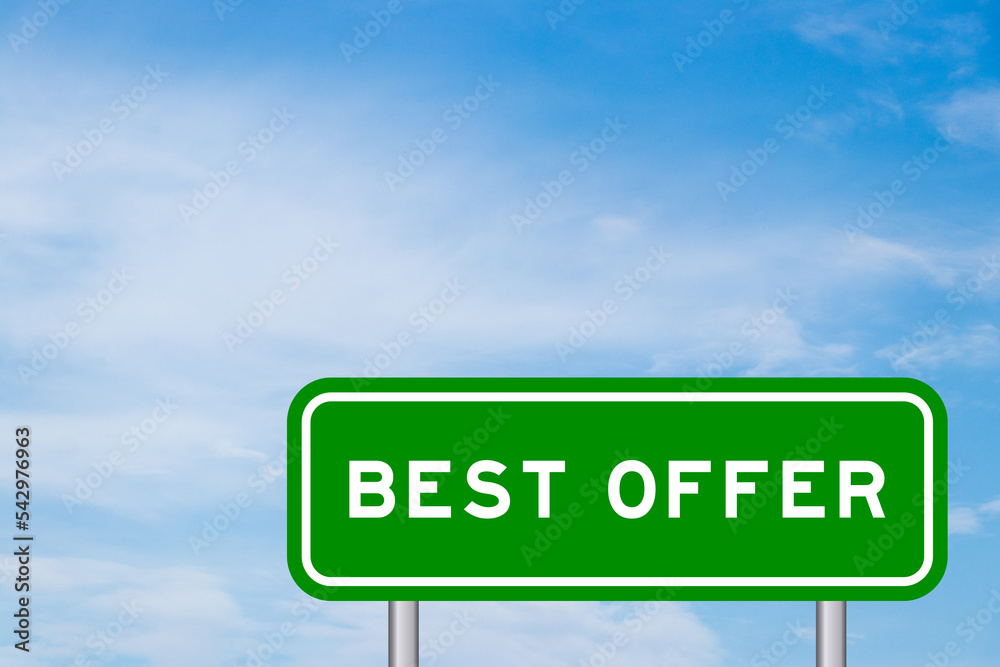Green color transportation sign with word best offer on blue sky with white cloud background