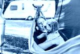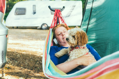 Relaxed woman listening to music with headphones lying in hammock with cockapoo puppy near motorhome on camping trip. Female living on camper car with animal, travel the world. Caravan car Vacation