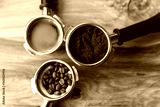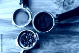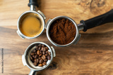 Different processes of preparing coffee by a barista in a coffee shop. Coffee beans, ground, ready. Coffee art concept.