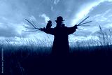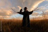 Scary scarecrow in a hat on a cornfield in cloudy weather. Black crow on his shoulder. Halloween holiday background