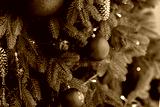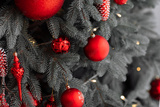 stylish christmas decorations on the tree, beautiful toys, balls, cones and lights in red colours. Christmas cozy atmosphere in living room, new year. Festive interior design.