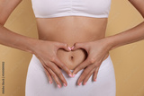 Woman in underwear making heart with hands on her belly against beige background, closeup. Healthy stomach