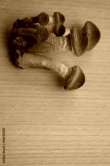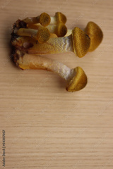 Clump of Honey Fungus on wooden table. Armillaria mellea on autumn season