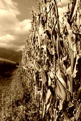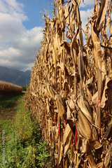 Corn field landscape with ripe corn cobs ready to harvest in northern Italy on a sunny day. Agricultural field on summer