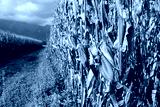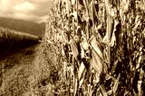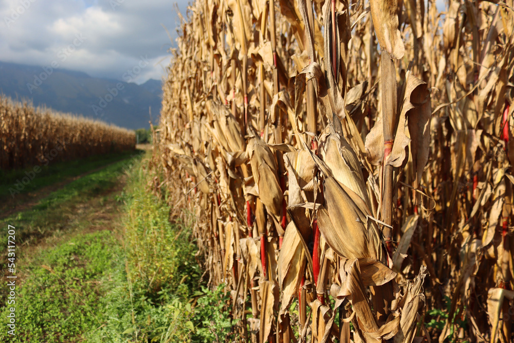 Corn field landscape with ripe corn cobs ready to harvest in northern Italy on a sunny day. Agricultural field on summer