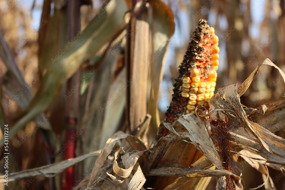 Damaged yellow ripe corn cob in field. Zea mays or maize ear damaged by bird or mouse feeding
