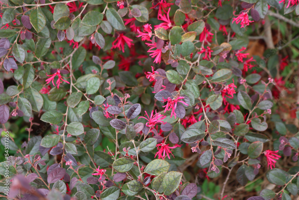 Pink Loropetalum japonica flowers on bush. Loropetalum bush in bloom on summer