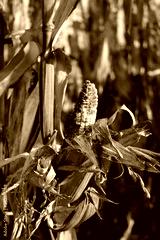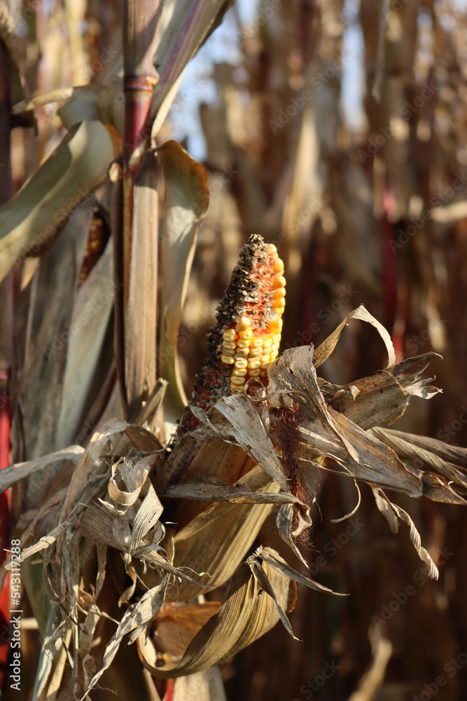 Damaged yellow ripe corn cob in field. Zea mays or maize ear damaged by bird or mouse feeding
