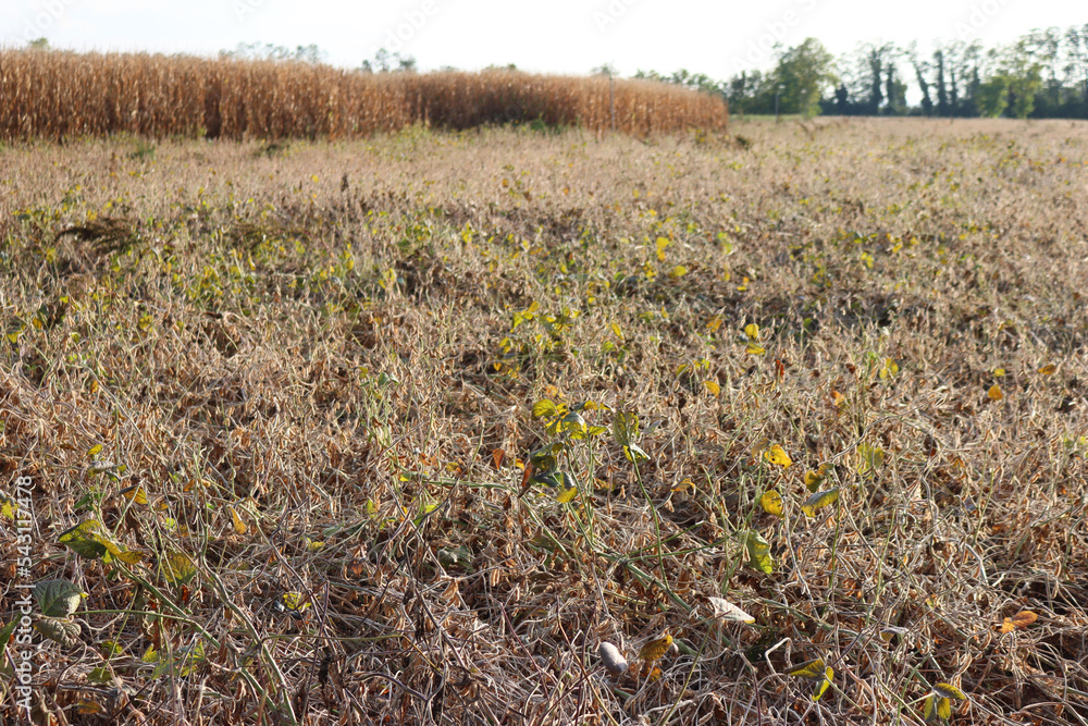 Agricultural soy field on autumn season, Dry brown soy plants ready to be harvested in the italian countryside