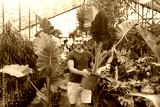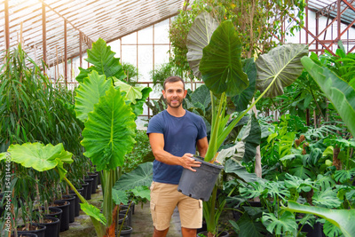 Caucasian male gardener smiling holding large pot with houseplant alocasia in tropical greenhouse farm plantation with monstera and ficuses.