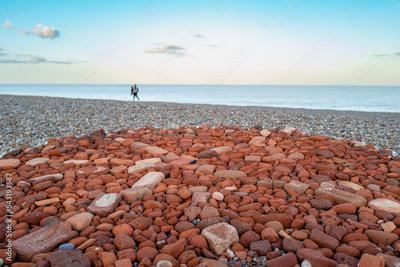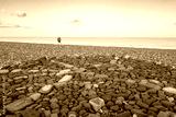 Shallow focus of impromptu stone pattern seen on a beach during late summer. A distant walker can be seen at the waters edge.