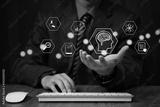 Businessman using laptop computer icon virtual screen education online and e learning on desk.