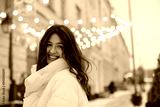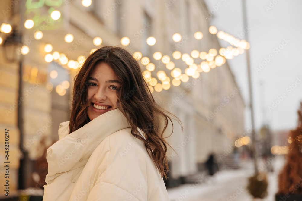 Positive young caucasian girl looking at camera with smile spending leisure time outdoors. Woman with brunette hair wears jacket. Concept of enjoying moments.